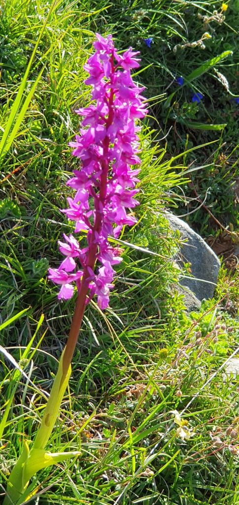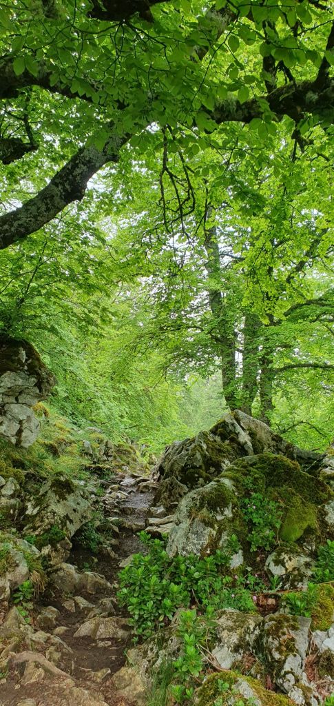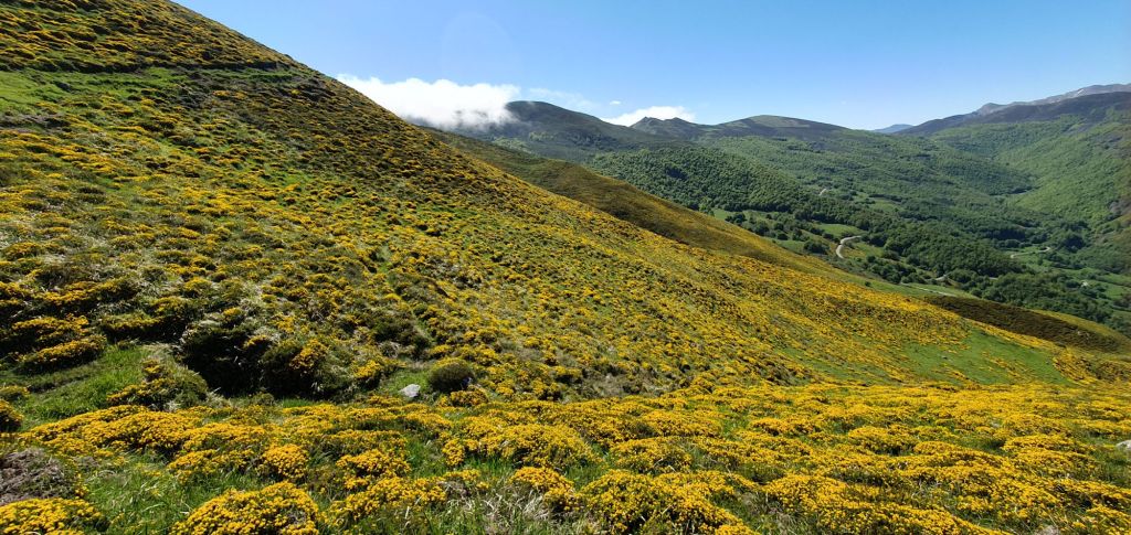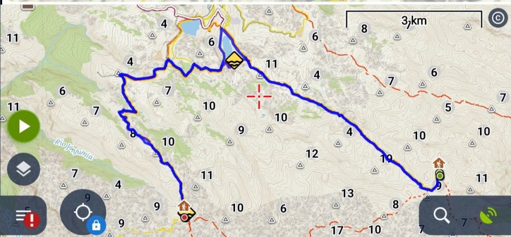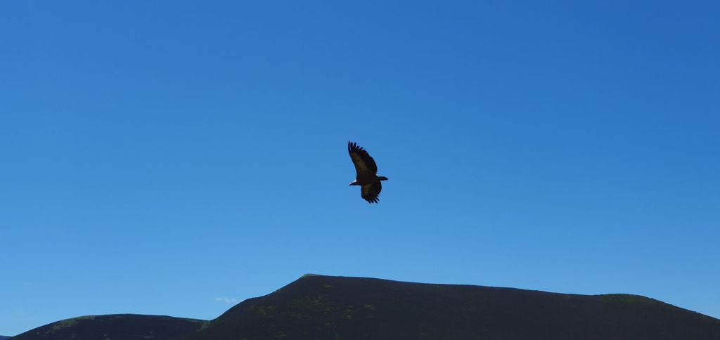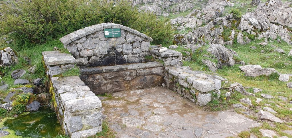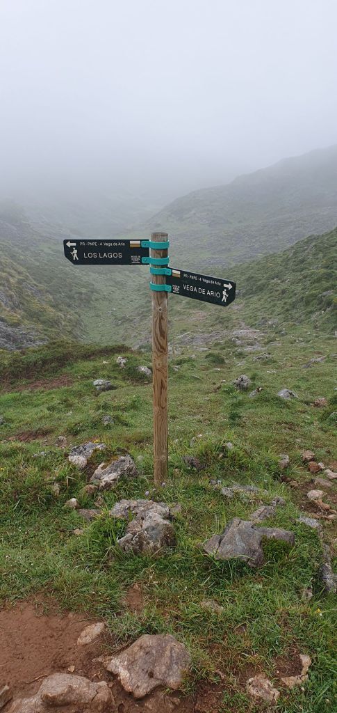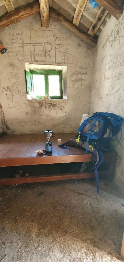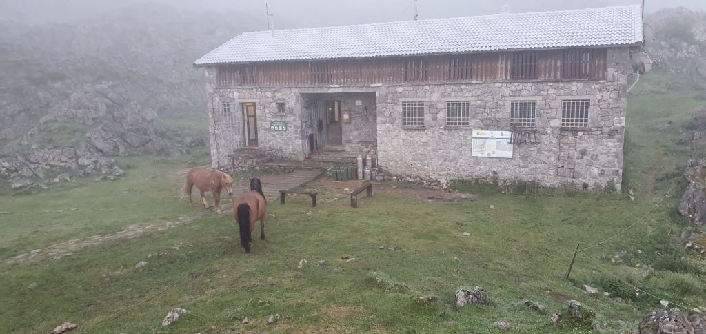 Hoewel het minder leuk is een tochtje ‘vice versa’ af te leggen, geeft het toch voldoening als ik na twee uur de refugio halverwege bereik, na een flinke stijging over ruwe stenen en door een lieflijke, maar steile bergweide. Langs een groot deel van het onregelmatige pad hangen plastic sjerpen en hier en daar staan vlaggetjes in de grond geprikt: er wordt komend weekend een ‘corrido’, een ‘trailrun’ gehouden. Ik kom al een paar oefenaars tegen; vreselijk, springend over de stenen, die hier en daar nat zijn vanwege kabbelend water over het pad. Rara jongens / meisjes, die bergrenners, vooral als je er route afstanden van 50 of 75 km voor af moet leggen…