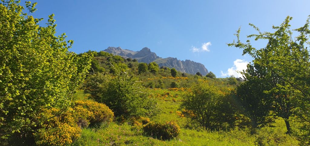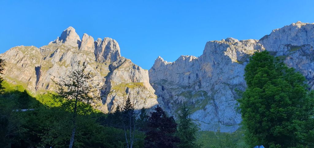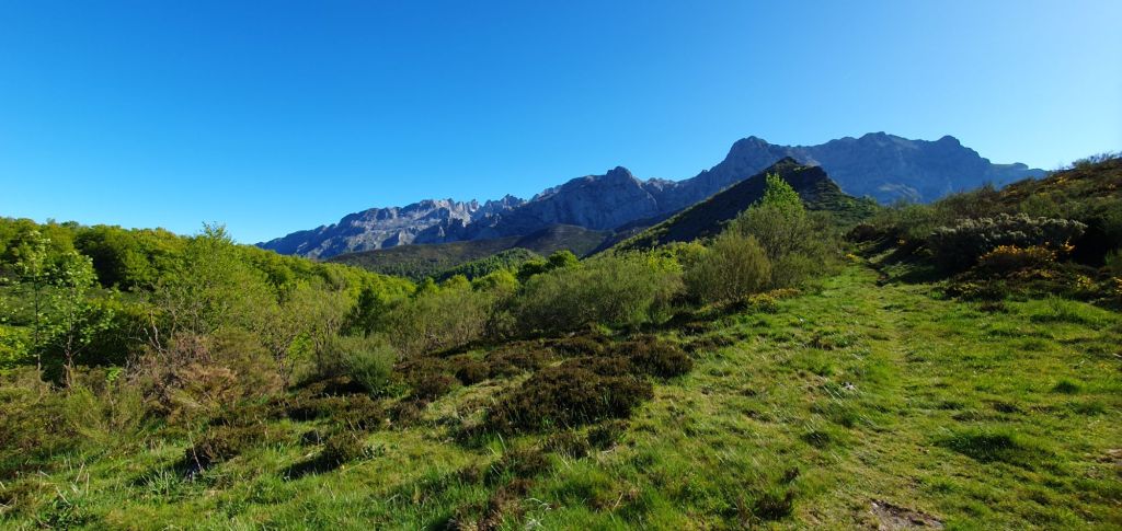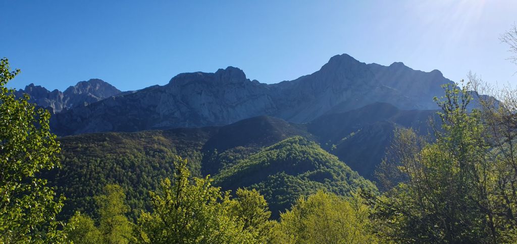 Al snel komt de kers op de taart van deze tocht in zicht, de Pico Urriellu, ook wel Naranjo de Bulnes genaamd. Een alleenstaande tand van 2.529 m hoogte, die op vrijwel alle internet pagina’s over de Picos prijkt. Rotsklimmers zijn er dol op. Ik kijk er met ontzag naar.