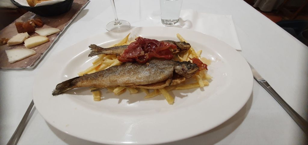 Als ik klaar ben en mij richting mijn hotel begeef, zie ik aan de andere kant van het pleintje twee bekende gezichten, T en A, uit München! Wat een enorme toeval en wat leuk om deze cirkel wel rond te maken. Zij vragen direct of ik mee ga eten en hoewel ik al een maaltijd op heb, ga ik natúúrlijk met hen mee, naar het sfeervol gelegen restaurant Casa Xurde, met de deuren wijd open naar het terras en een weiland met de bekende zachtbruine, gehoornde koeien. Ik houd het weliswaar bij (nog meer) wijn, terwijl zij andere lokale heerlijkheden bestellen. Een absolute aanrader.