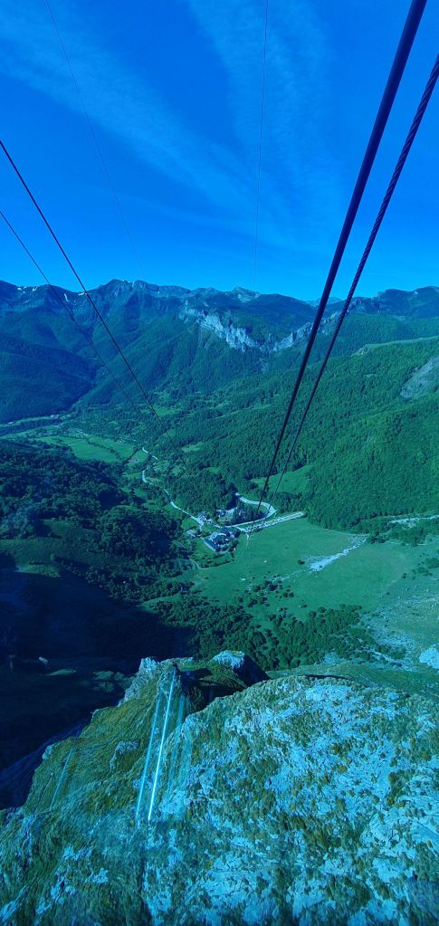 Daar sta je dan, ‘in the middle of nowhere’. Hoewel al het verkeer hier langs moet, vanwege de opgebroken weg, is het dun bezaaid met de vervoersmiddelen (een paar tractoren..). Gelukkig heb ik aan het begin van de tocht een taxikaartje gefotografeerd en dat komt nu goed van pas. Met een kwartier wachten wordt ik na een lange rit keurig in Poncebos afgezet, bij de ‘funicular’, een kabelspoorweg van 5 km door een tunnel in de berg, naar Bulnes, het aanvankelijke eindpunt van mijn ringtocht in de Picos. De funicular bestaat sinds 2001; daarvoor was het alleen per karrespoor bereikbaar. Nú neem ik wél een retourtje voor de 400 m hoogtemeters die het treintje in 7 minuten aflegt.