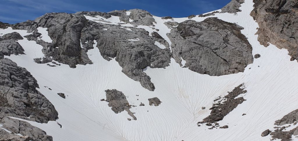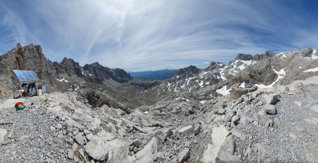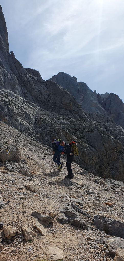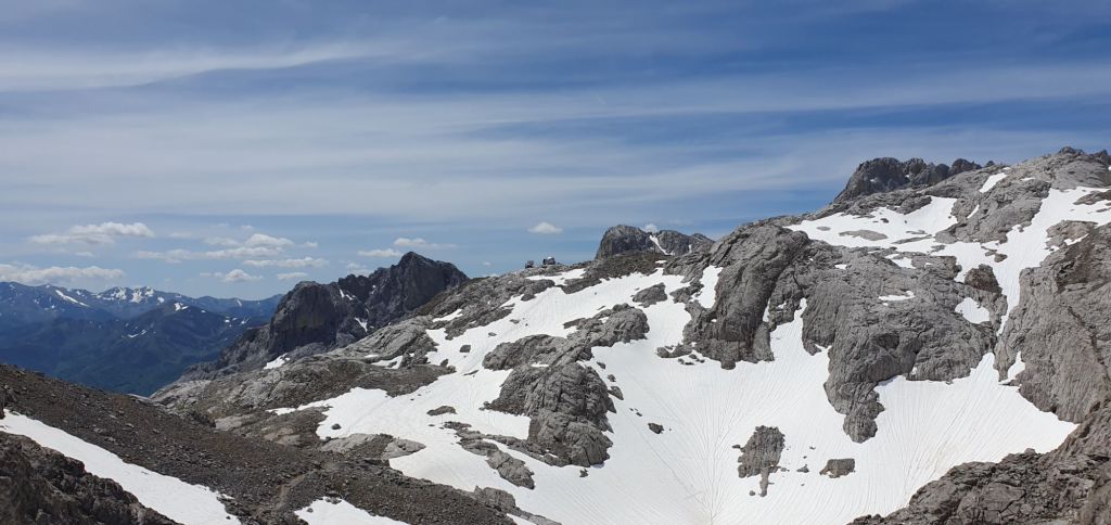 Ook nu is de lucht zonneklaar en het is ronduit warm. Ik ben er al achter gekomen dat heen-en-weer naar Refugio de Urriellu niet gaat lukken, maar ik heb mijn zinnen gezet op Refugio de la Terenosa, die halverweg de laatste geplande route ligt. Zo kan ik op tijd de kabelspoorweg terug nemen.