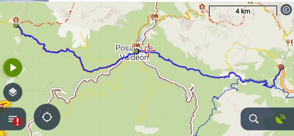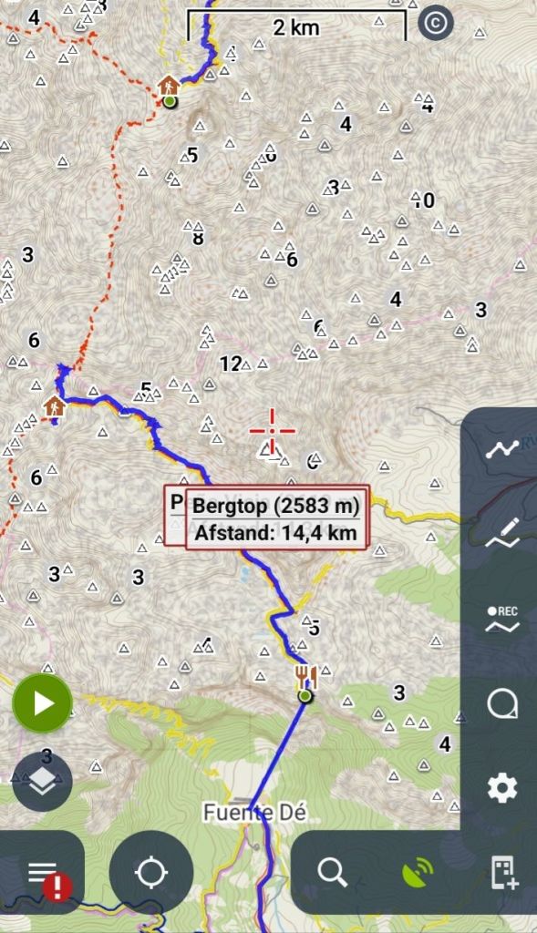 Met een totale geplande route van 95,6 km eindigde ik die dag op 87,3 km, de wandeling terug naar Fuente Dé niet meegerekend. Een ring met opening van 8,3 km.. Nu kwam het er op aan hoe snel ik naar Poncebos kon terugkeren, om de route in omgekeerde richting (in dit geval kloksgewijs) weer op te pakken, tijdens mijn laatste dag! Bij het verlaten van de gondel zag ik een ouder stel in een Nederlandse kampeerbus stappen. Landgenoten! Altijd bereid elkaar te helpen, toch? En ja hoor, in de roos; ik kon meerijden naar Potes, 23 km verderop in het dal. Zij kwamen uit Soesterberg en maakten een trip door Noord-Spanje. Moet ik met M ook een keer doen en dan ook in zo’n mooie, onopvallende bus: donkerblauw, zonder toeters of bellen; alsof je onderweg bent naar een werkklus (nou, die kwam er..!).