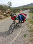 Het doel van de dag is een camping in Navajas. Maar ongeveer 5 km ervoor, in het dorpje Altura, houdt de via verde plotseling op. Geen bordje, wegomlegging, niets!? Ik vraag diverse locals, maar ik word glazig aangekeken. Kan je het je voorstellen? Als je in Katwijk het fietspad door de duinen naar Wassenaar vraagt en niemand die je kan helpen? Ik dwaal wat rond en zie een jonge kerel in hardloopkleren: die weet raad! Hij loopt er regelmatig. Ik moet terug naar het punt waar de route ophield, dan een aantal kleine paadjes op, een bruggetje, een flinke helling naar beneden en, ja inderdaad, gevonden! Moe, maar opgewekt (Rocinante ruikt stal) begin ik aan de laatste paar kilometer naar Navajas. Het bruggetje, de helling en… pats, lekke band. Op de eerste dag! In 2011 had ik er goed en wel 800km opzitten voor mijn eerste (en enige) platte. Daar sta je dan. In ieder geval niet in the middle of nowhere. Sterker: ik ben net hostal Victoria gepasseerd, tegenover een Caravanpark en een zwembad.. leeg welteverstaan. Nou, dan maar geen camping, maar een heus bed en zelfs een bad (1,5 meter lang weliswaar). Fantastisch!
