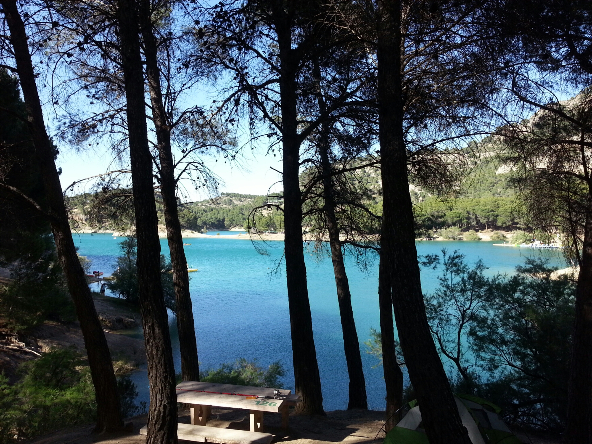 Heb je ooit wel eens in een Amerikaans Nationaal Park op een camping gestaan? Nou deze (36.923093,-4.805544) zou er zo voor door kunnen gaan. Alleen de beren en de ‘bearboxes’ ontbraken helaas (nou ja, helaas?). Grote dennen met zanderige bodem, een azuurblauw meer en voor iedere kampeerplek een picknicktafel en banken, zij het hier van steen en niet van hout. Prachtig! Geen stroom, geen wifi, maar natuurschoon en een heerlijk bad voor de (tent)deur. Ik ben er direkt ingesprongen, in fietskleding… Eten voor de tent, wijntje erbij.. en ik ga heerlijk slapen.. (dacht ik).