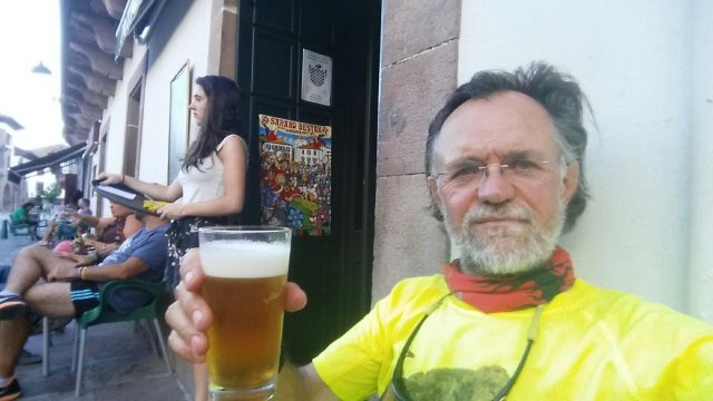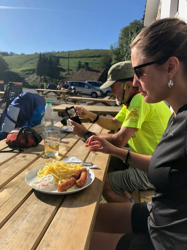 Met kraakschone bergschoenen kan ik op een terras al aan de cerveza, terwijl J&R nog afdalen naar het dorp. Mijn ge-appte foto met de nieuwe schoenen en de selfie met glas bier wordt ‘grommend’ beantwoord.
