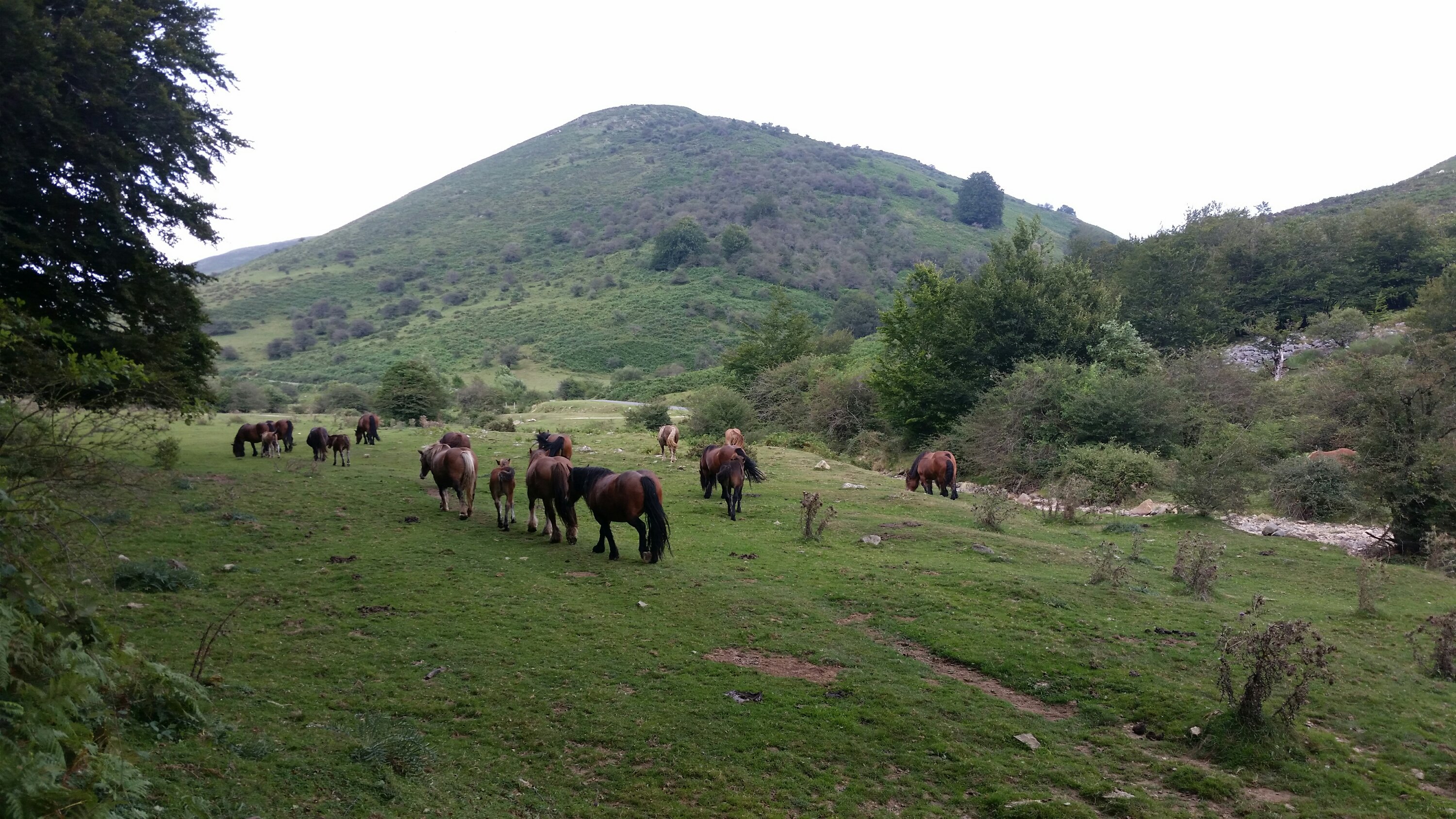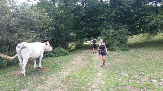 Na enkele kilometers lopen we het bos uit en vervolgen de route over een groene kam, met overal paarden (met bellen), koeien (met bellen) en schapen (inderdaad).