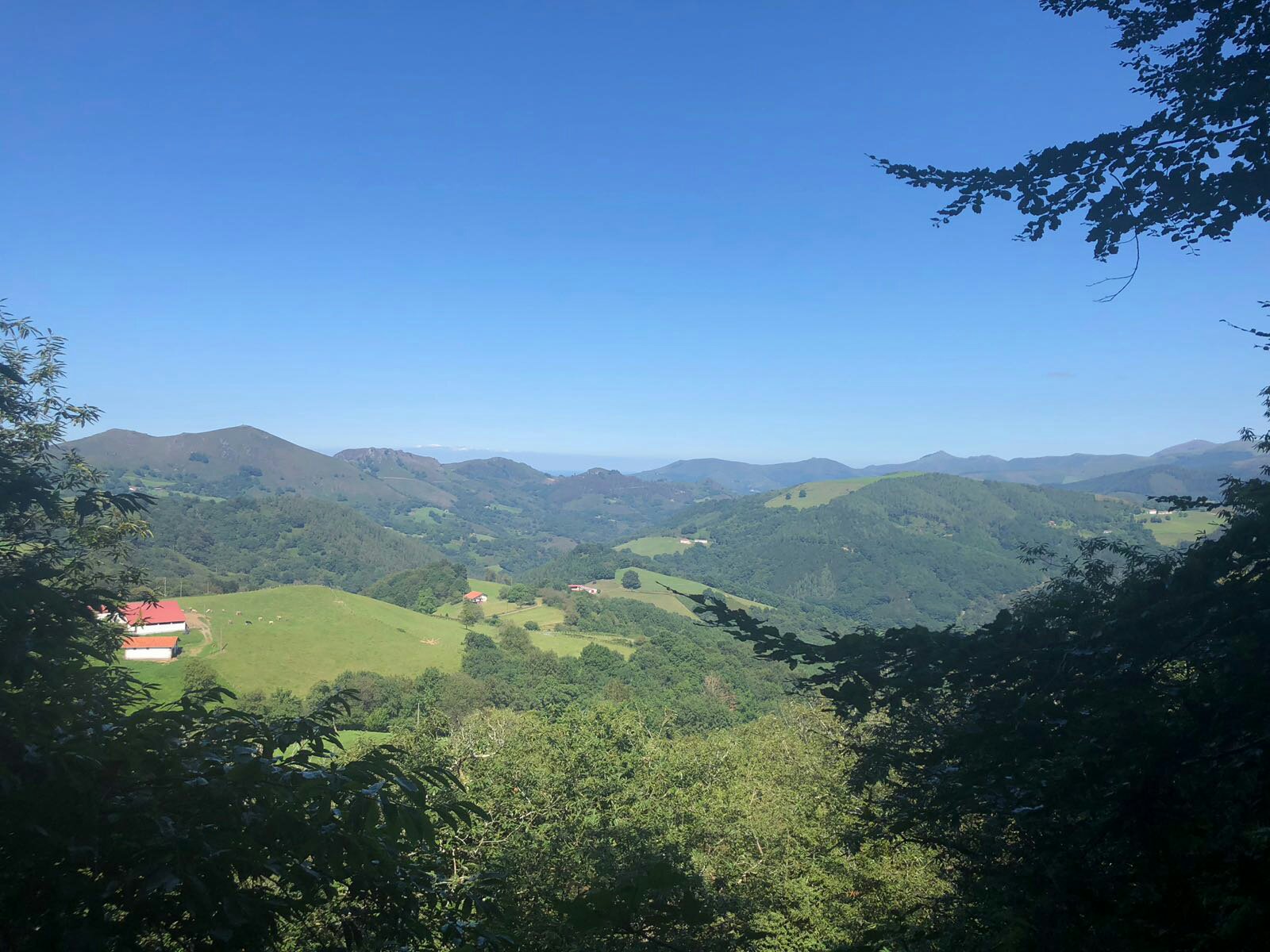 Inmiddels is de temperatuur de 30° ruim gepasseerd, al is het maar op gevoel. De klim naar top 1 en daarna top 2 is ‘killing’. De watervoorraad slinkt snel. De uitzichten over de Baskische heuvels zijn echter fenomenaal; een extra reden om regelmatig even te stoppen (maar ook omdat de rugzak in de schouders snijdt; toch nog iets te zwaar..!?).
