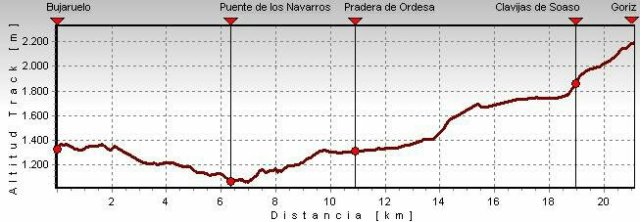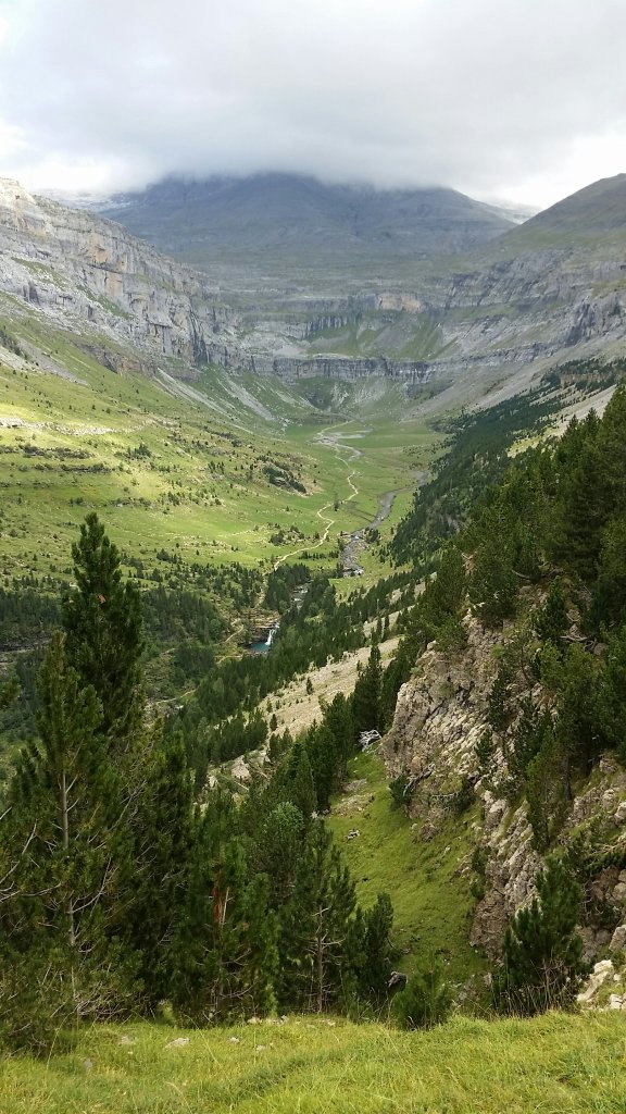 Aan het einde van de vallei torent de Monte Perdido met zijn 3355 m hoogte majestueus boven alles uit. Het wordt echter bewolkt, terwijl ik juist aan het einde bij de paardenstaart waterval naar boven moet, richting de Refugio de Goriz. Even vrees ik dat mijn pad straks in de wolken verdwijnt, wat weer een nieuwe ervaring zal opleveren: lopen in witte watten…