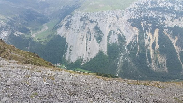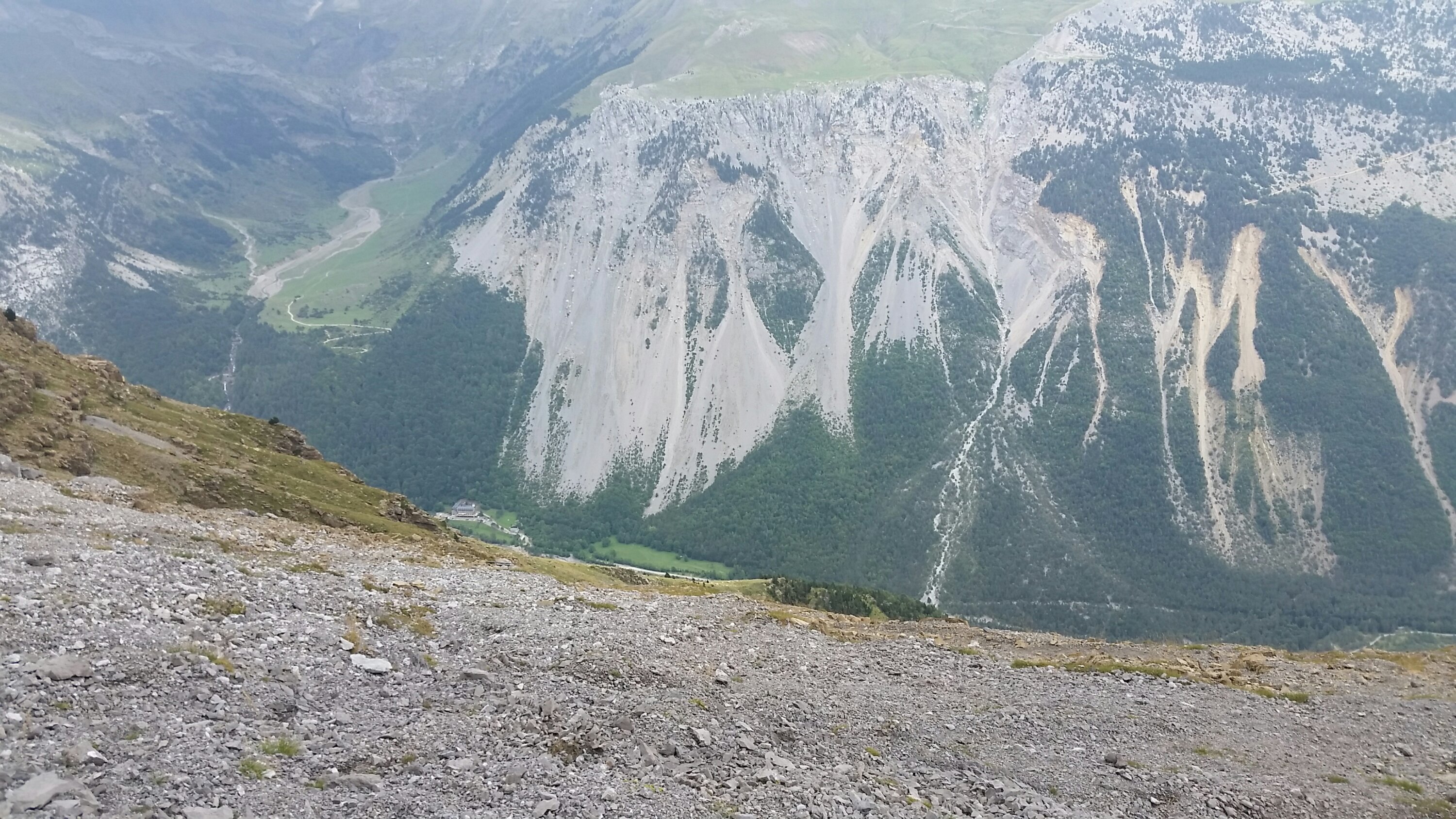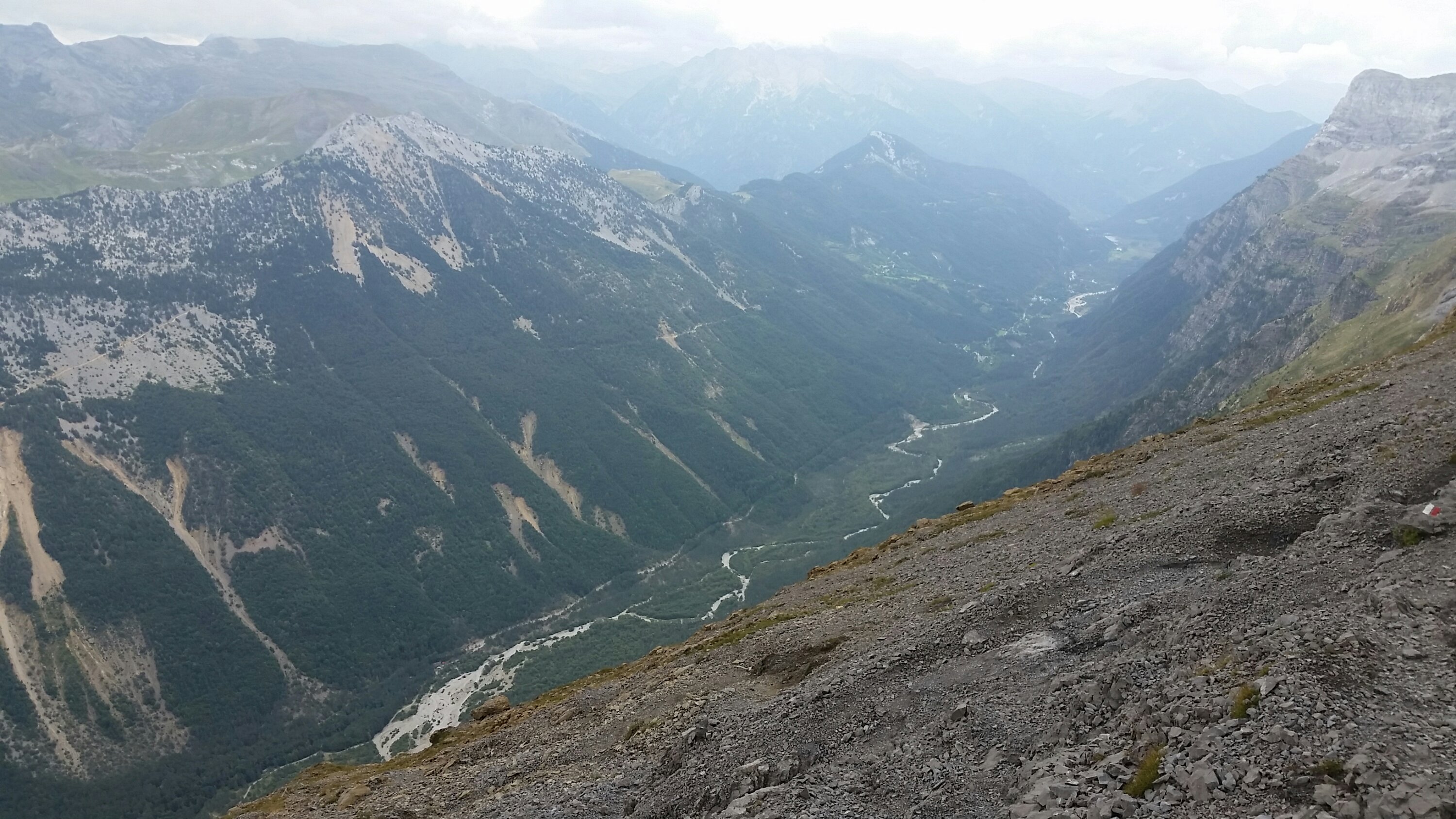 Maar al snel steeg het pad naar de Collado de Arrablo (2.343 m), met daarna een afdaling die puur klauterwerk inhield, met bijbehorende afgrond. Om vervolgens weer te klimmen naar de Collado de Añisclo (2.453 m), waarna volgens het boekje: ‘the 1.000 m descent is unpleasantly steep and very intimidating, with awkward rocksteps to climb down (..) and is mentally as well as physically tiring, requiring continuous concentration’. Ahum, en dat in m’n eentje?