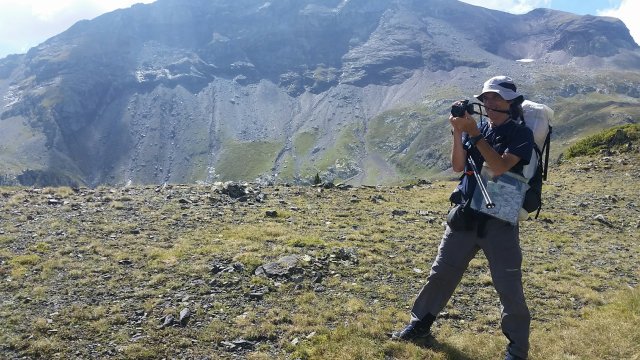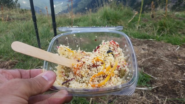 We lunchen op een hellinkje in de zon; hij is vegetarier met een speciaal dieet. Een enorme zak met crackers en noten komt uit zijn forse rugzak. En flinke hompen kaas. Hij heeft eten voor een week bij zich, want het eten in hutten wil/mag hij niet hebben. Iets te snel naar mijn zin wil hij al weer verder lopen; van verder stoppen onderweg komt het niet…