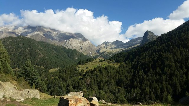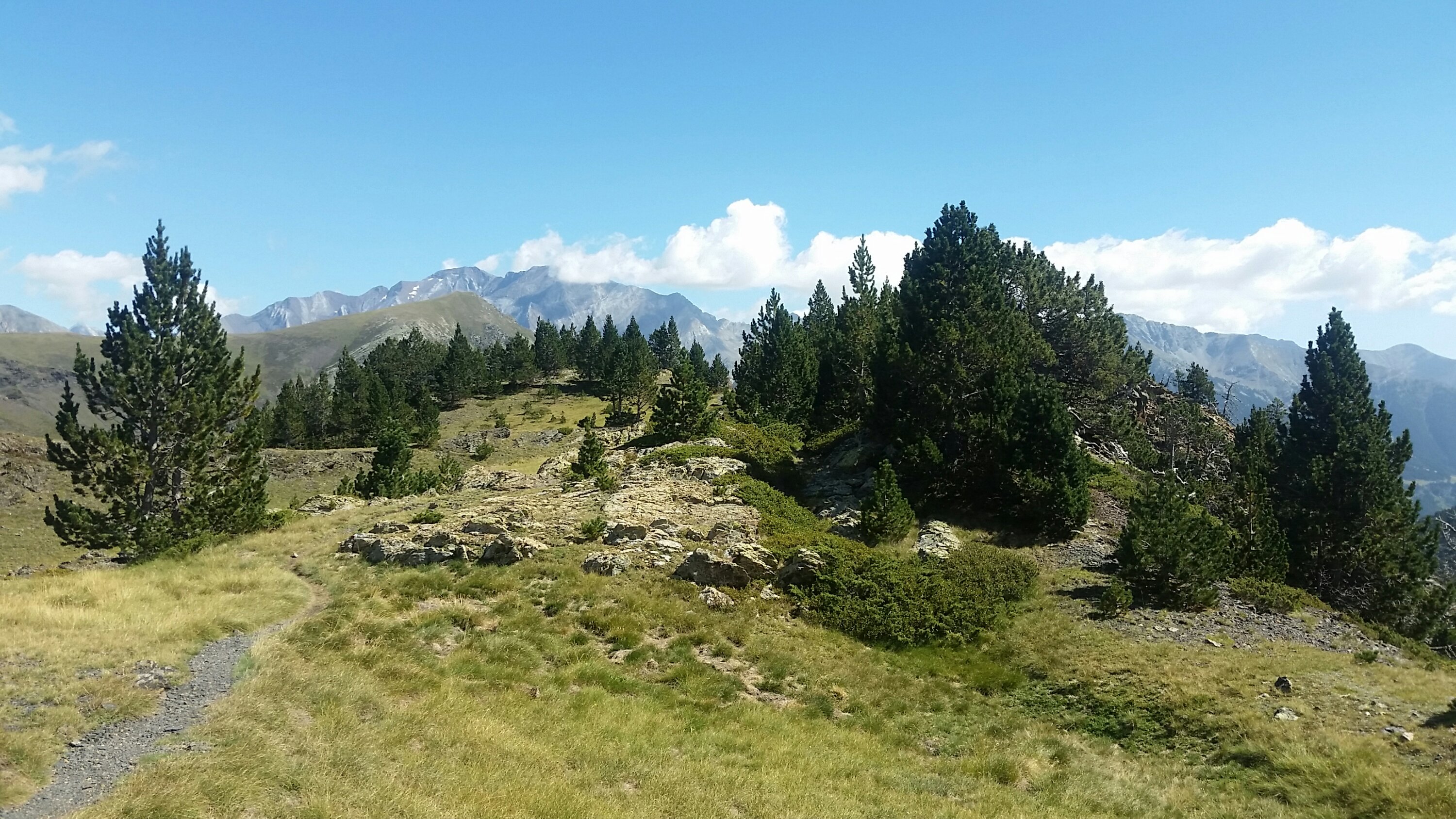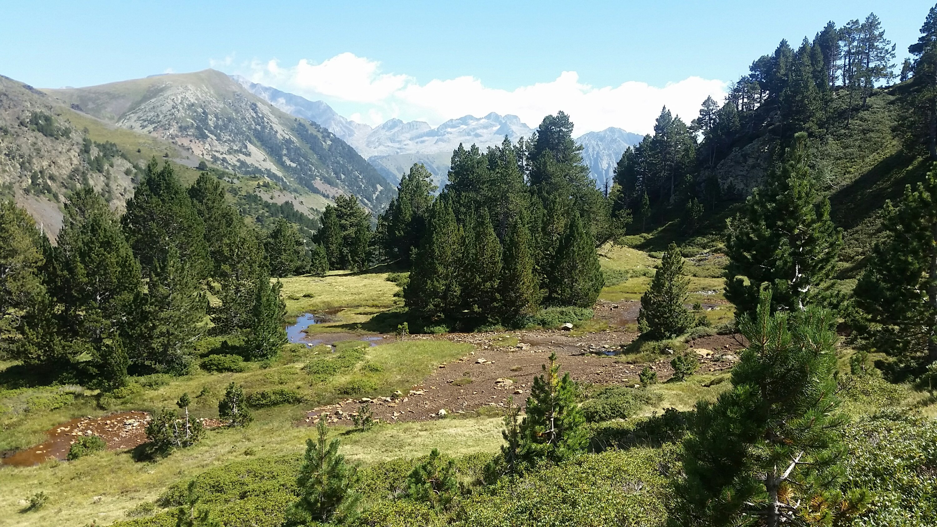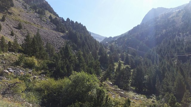 Omdat het begin van het traject over een breed karrespoor door het bos gaat, kunnen we uitgebreid informatie uitwisselen. Voor zover mijn Spaans het toelaat, natuurlijk, maar Alber is niet te beroerd om dingen te herhalen of uitleg te geven. Hij weet veel van de regio, hij heeft de GR11 al eerder in omgekeerde richting gelopen, ook delen in de winter en hij klimt bovendien regelmatig in dit gebied. Alle bergtoppen die we zien kent hij bij naam!