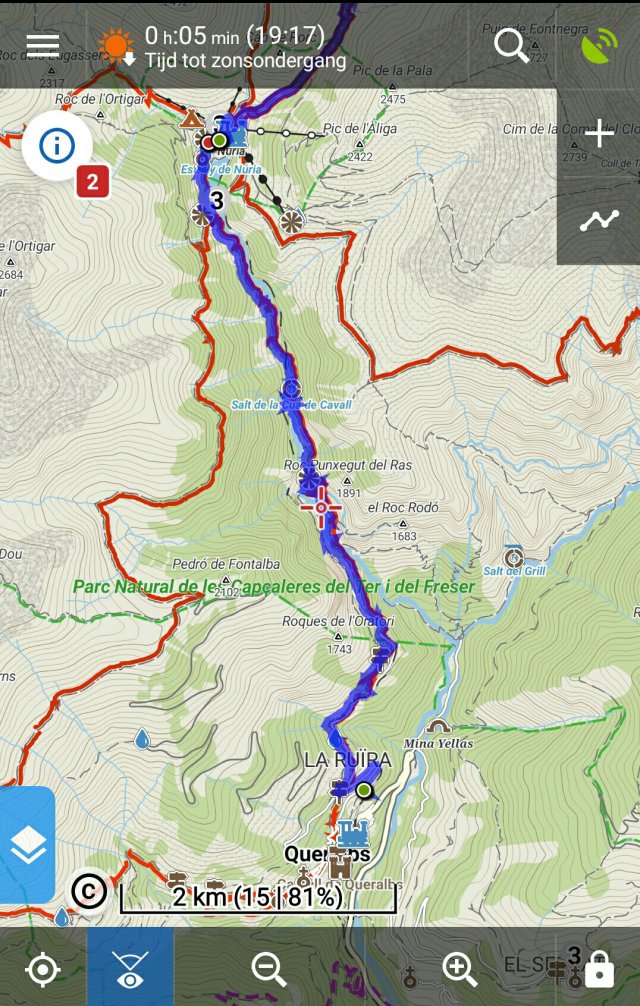 Dat we eergisteren in Queralbs een tussenstop hebben gehad, heeft enerzijds te maken met de forse klim, die we anders in de middag zouden moeten doen. En anderzijds: omdat ik toch nog een dag ‘over’ heb voordat ik Bas ontmoet in Albanyà, is het een logischer keuze om een route op te knippen, dan een hele extra dag in een klein dorpje te verblijven. Ik heb geen spijt van het verblijf in één van de kleine ‘cottages’ (want daar lijken ze op) van Masia Can Constans in Queralbs, want het is er heerlijk; hier kom ik nog eens terug met M!