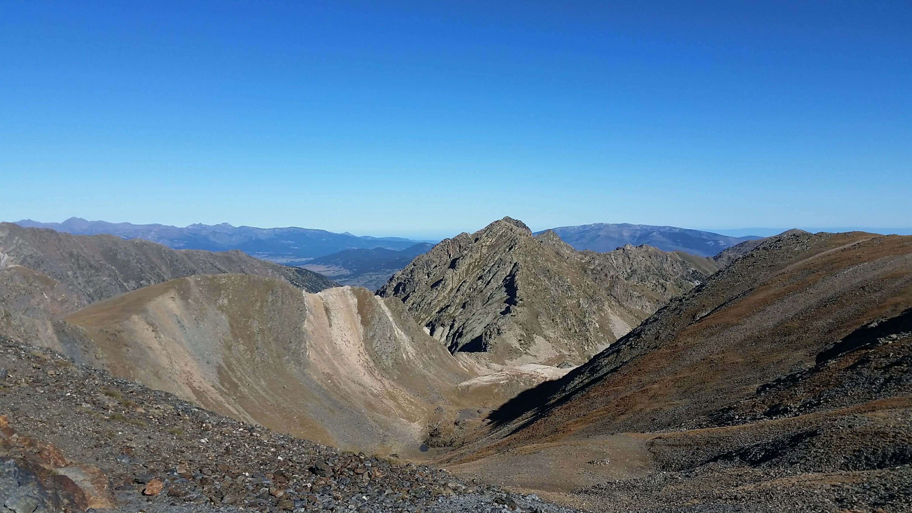 Het weer is kraakhelder en vrijwel windstil. De klim vanuit Núria, dat zelf op bijna 2.000m hoogte ligt, is geleidelijk over kale bergen, die om acht uur ’s ochtends gelukkig nog in de schaduw liggen. Hoe verder we vorderen, hoe nietiger het grote complex wordt, dat overigens wel al vroeg door de zon wordt beschenen.