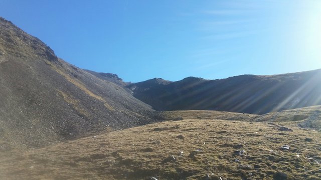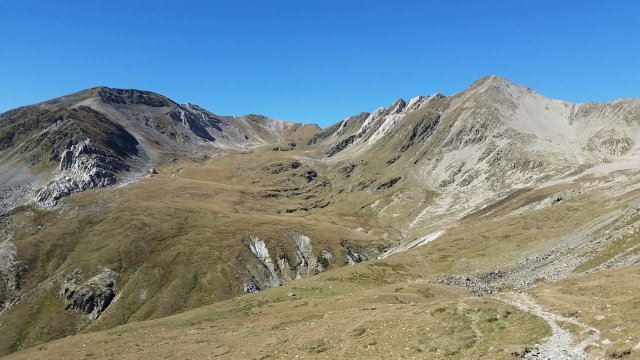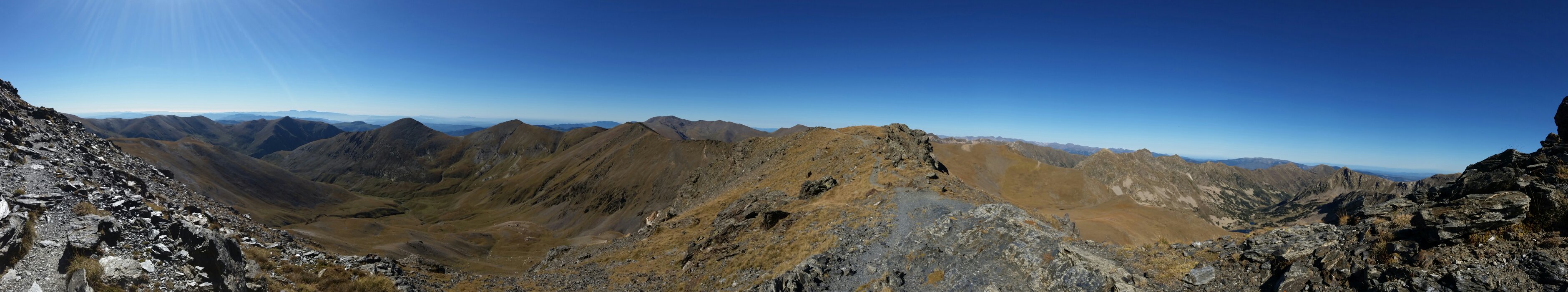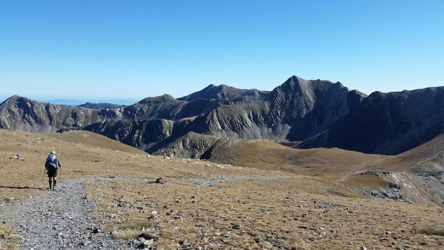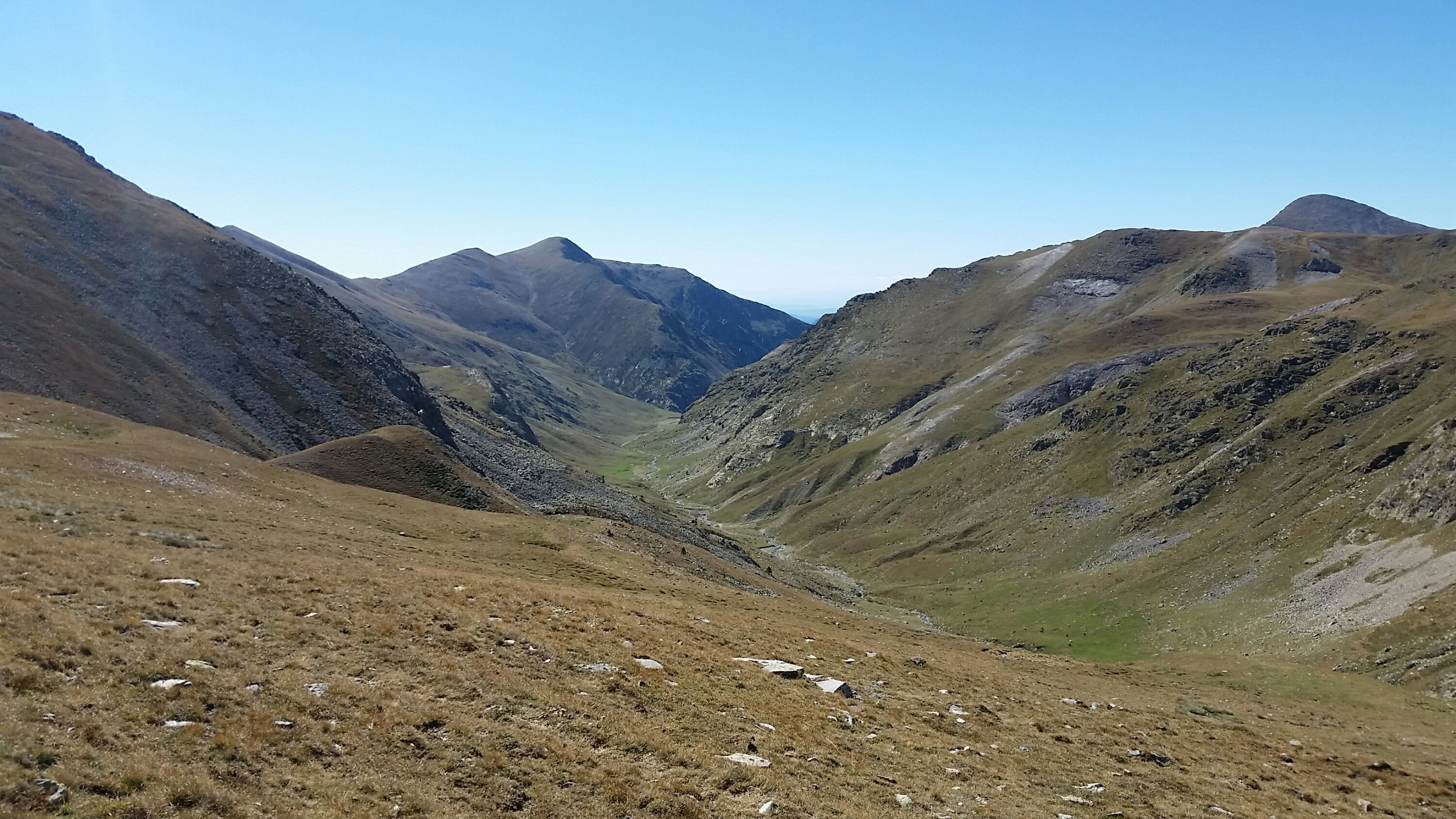 De hele tocht voert over de kale rotsen, met steeds weer nieuwe panorama’s, die zich voor ons uit ontvouwen. Een groep gemzen staat onverstoorbaar de laatste sprietjes gras weg te kauwen. Ze zijn ver weg, maar het feit dat ze niet wegvluchten, kan betekenen dat hier niet gejaagd wordt. We zien de kale skipistes van Vallter 2000. Pas laat in de middag keren we terug naar meer beboste berghellingen.