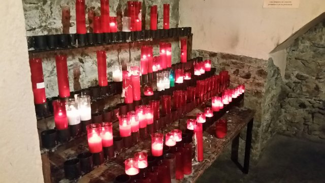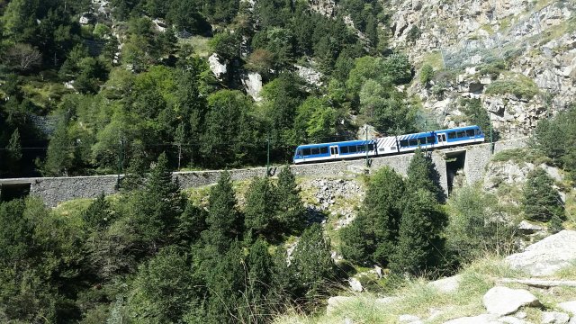 Gisteren dus naar het heiligdom van Núria, met een bijzondere historie en dat jaarlijks vele gelovigen trekt (o.a. jonge stellen die graag een zoon als eerstgeborene willen hebben; een bezoek aan de kapel zou hiervoor garant staan..), dat alleen te bereiken is via een voetpad door een indrukwekkende kloof (waardoor wij zijn gelopen), of met een ritje met de ‘cremallera’, een tweewagons tandrad-treintje, dat over een smal traject door de kloof loopt en regelmatig in en uit tunnels duikt. Dat bij onze boeking in het heilige hotel ook een ritje met het treintje was inbegrepen, heeft ons niet doen verleiden: als pelgrims hebben wij het complex natuurlijk te voet bereikt! De indrukwekkende kloof was het zeker waard.