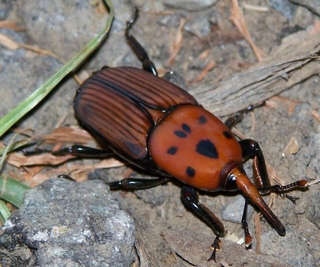 Een onooglijk kevertje, met een flinke snuit, die een gat boort in de kern van de stam van de palm en daar zijn eieren legt. De larven eten vervolgens de zachte kern op en ‘pats’, de palm bezwijkt, omdat de sapstroom stopt. Enorme palmen, met stammen van meters hoog, met bovenin verlepte, hangende palmtakken; ook erg triest om te zien en er zit niets anders op dan de dode boom om te zagen. Dat zie je aan de oostkust van het vasteland heel veel.Maar hier op het eiland heb ik nog geen enkele aangetaste palm gezien.