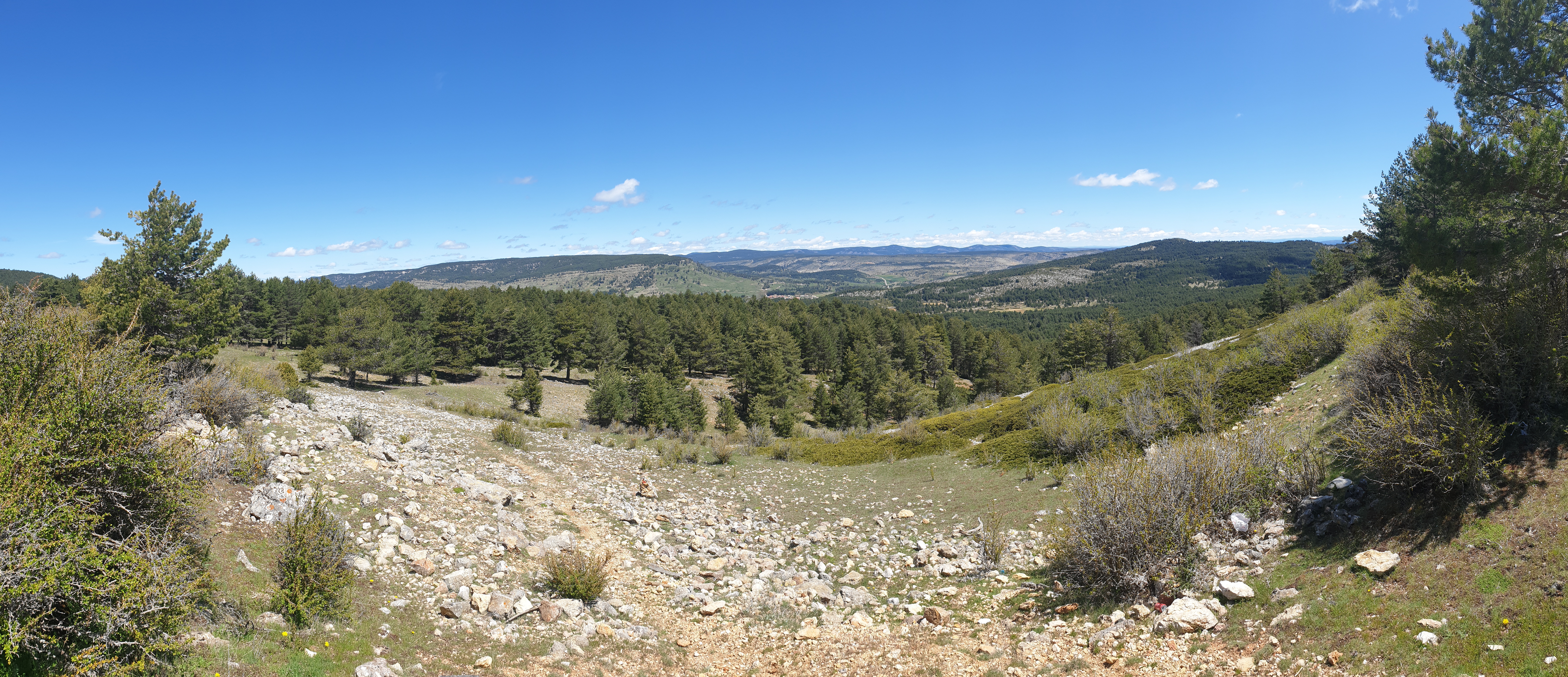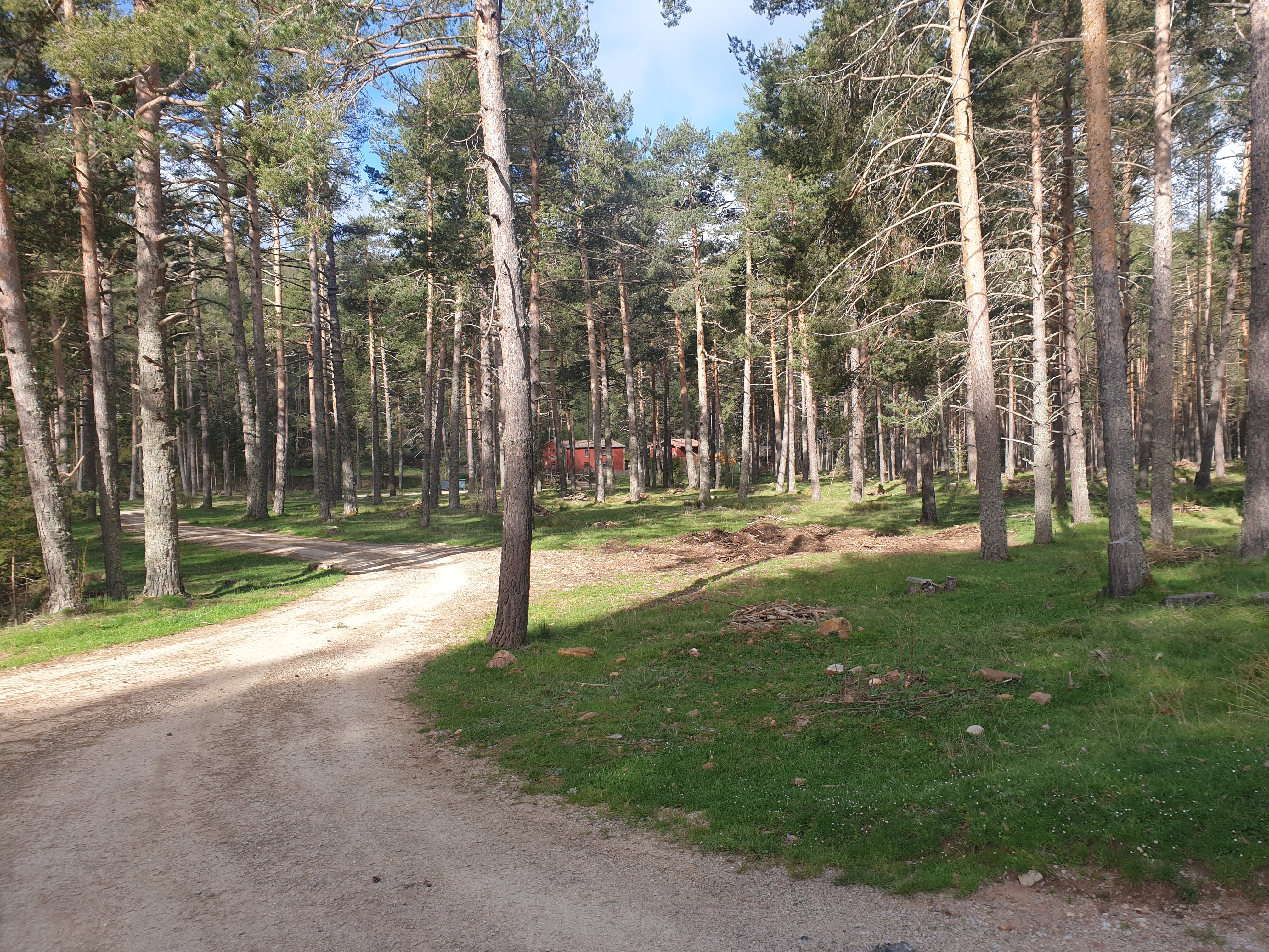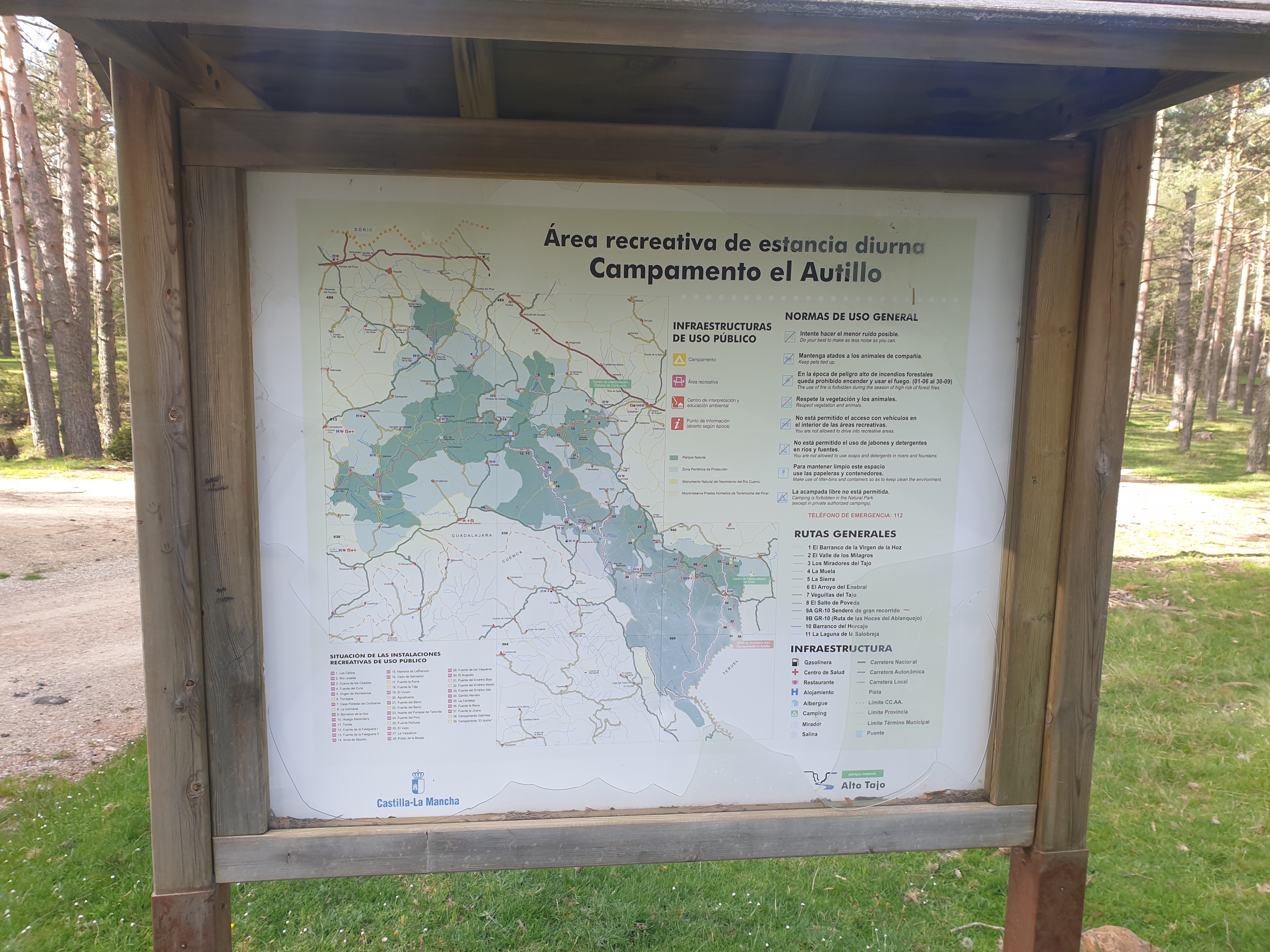 Ik passeer een camping, met enkele blokhutten. Iets verderop is een herberg. Duidelijk bedoeld voor de vele wandelaars die hier normaal zullen komen: het stikt van de wandelroutes, aan de vele wandel-wegwijzers te zien. Maar nu even niet; alles is dicht. Ik neem wat foto’s, want dit lijkt me een plek om nog eens met M terug te komen: de Sierra de Albarracín. Net heb ik mijn camera weer als routeplanner op mijn stuur geïnstalleerd, of ik zie een grote herdershond tussen de bomen door op me af komen. O jee, als dat maar goed gaat… Hij (maar het kan evengoed een zij zijn) rent en is duidelijk al even onderweg, aan zijn gehijg te zien. Maar hij komt wel op me af!