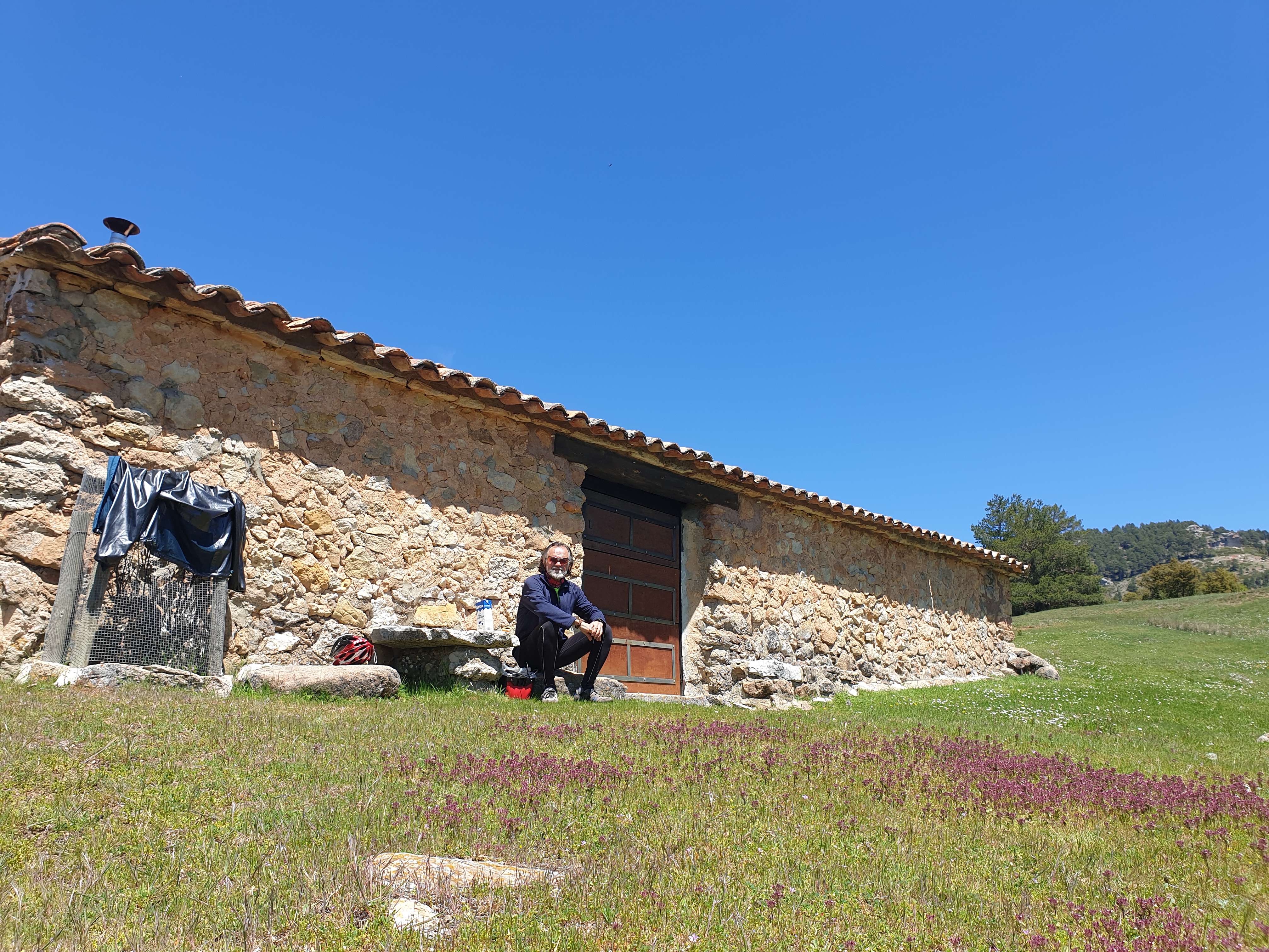 Ik lunch bij de Taag. In 2015 ben ik hier ook in de buurt geweest, bij de ‘Nacimiento del Tajo’ (7,5km oostwaarts) en ben ik over deze ‘majestieuze’ rivier gesprongen: daar nog geen 50cm breed, in Lissabon minstens een kilometer. Waar ik nú lunch heeft de weg een bruggetje van een paar meter nodig. Een mooie schapenstal, met een stenen bankje en tafeltje ervoor, is een uitstekende plek om lekker een uurtje in de zon te vertoeven. Net de Alpen; ik mis mijn wandelmaatje HK oprecht!