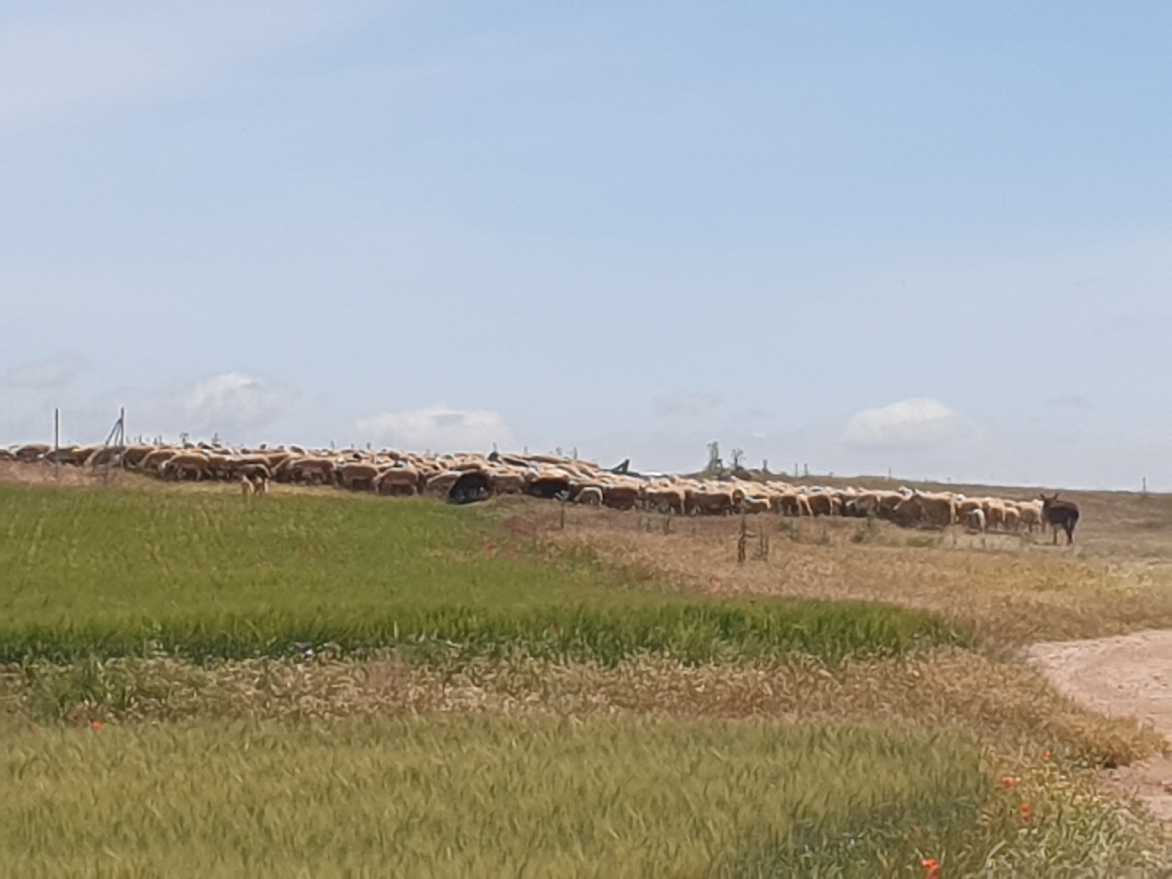Ik zag een herder met een grote kudde schapen, die zich -hij voorop- met verbazend grote snelheid naar het dorp spoedde. De ‘bezemwagen’ was een ‘burra’ (geen ‘burro’ zei de herder later), die de kudde op een drafje volgde. De herdershonden renden links en rechts om de de troep elkaar te houden. Ik was te laat om het plaatje van dichtbij vast te kunnen leggen, maar de spoed van de herder verraadde zijn doel: de kudde werd naar de kraal geleid, waar ik alsnog een praatje kon maken. Eén van de jonge herdershonden sprong enthousiast tegen me op; een oudere bleef op veilige afstand, continu naar de schapen kijkend. De herder ging koffie drinken!