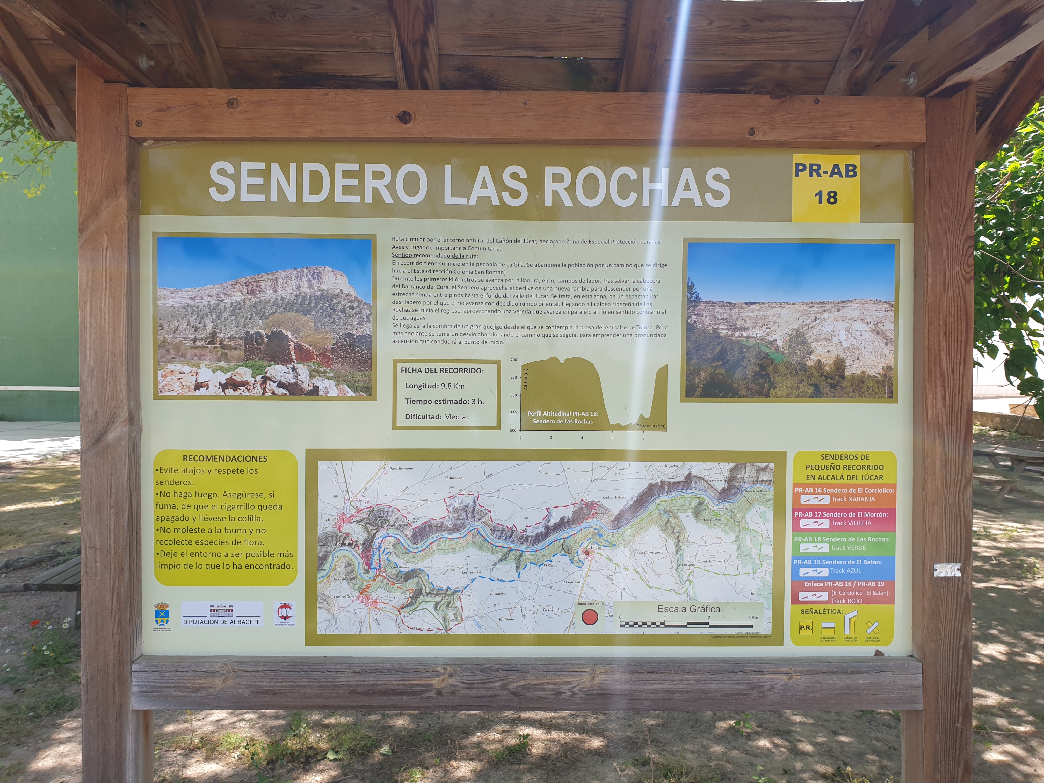 Maar laat ik nu over mijn ‘rustdag’ beginnen. Op een informatiebord in Alcalá zie ik een leuke wandelroute, de ‘Ruta el Batan’. Vanuit het dorp (vanzelfsprekend vanaf rivier-niveau) eerst fors stijgend naar de rand van de kloof, verder vervolgend over de bovenkant, om na het dorpje La Gila weer de diepte in te duiken en via de rivierbedding terug te keren naar Alcalá. Ongeveer 3,5 uur. Ik doe er uiteindelijk 5 uur over..
