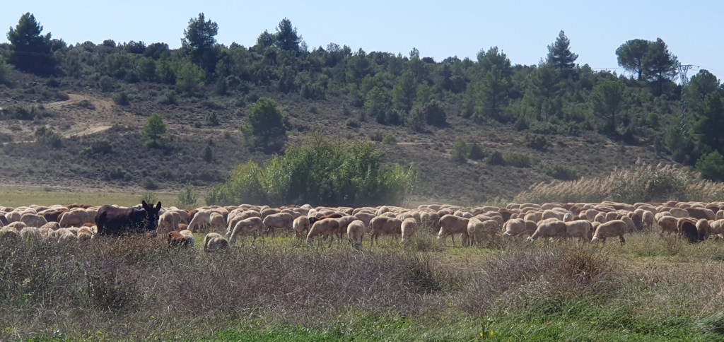 Ik zwaai naar de herder, hij beantwoordt dit met een opgeheven staf. De ezel, die vlak bij hem staat, begroet deze niet-alledaagse gebeurtenis met een schorre blaat. De kudde graast ondertussen -tijdelijk onverstoorbaar- door. Heerlijk, dit maak je alleen nog in Zuid Europa mee.