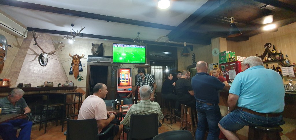 Na 63km kom ik aan in Carboneras de Guadazaón, waar het gezellige hostal Cabañas (39°54’13″N 1°48’24″W) mij welkom heet. Een soort wegrestaurant, annex hotel, annex samenscholings plek voor de lokale bewoners. Dat houdt in: veel lawaai, een brullende TV, waar nagenoeg niemand naar kijkt, 85% (dikke) lokale ‘hombres’, 10% (dikke) lokale echtgenotes en verder het restpercentage aan tussen de tafels zwervende kinderen, tikkertje spelend, zonder dat iemand er last van heeft of er iets van zegt (wat wil je: ze horen of zien het niet eens..). De patron tapt de ene na de andere ‘canja’ (‘rietje’, naar de vorm van de tuit van de biertap), koffie met of zonder ‘shotje’ en de gasten gooien de pinda- en zonnebloemschillen zonder scrupulus op de vloer van de bar. Het opgezette everzwijn naast de TV aanschouwt het tafreel meewarig, maar gelaten..