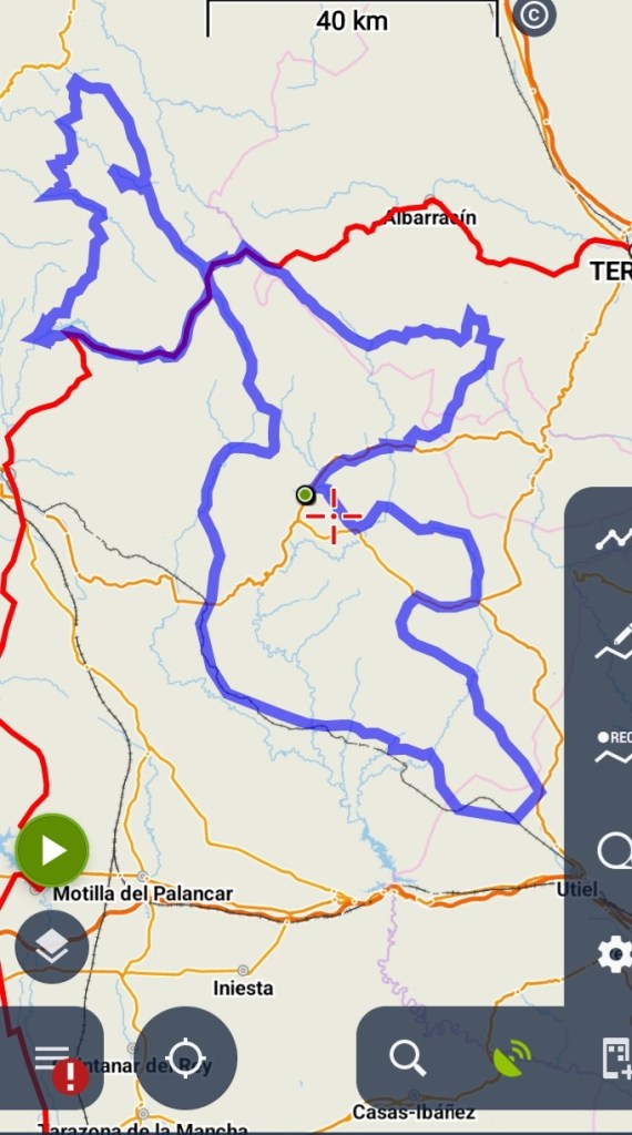 Vandaag gepakt en bezakt, met de fiets achterin de auto, naar Camporrobles gereden, min of meer het dichtstbij zijnde punt in de vooraf op Locusmap geplande route (iets ten noorden van Utiel; zie kaartje bovenaan). Locus is nog steeds mijn favoriete hiking / biking app: eenvoudig routes te plannen en op te nemen, met mooie kaarten en handige functies; ik krijg er niets voor, maar ik maak graag reclame voor dit Outdoorwonder. Jammer voor Apple bezitters: het werkt niet op een Iphone…