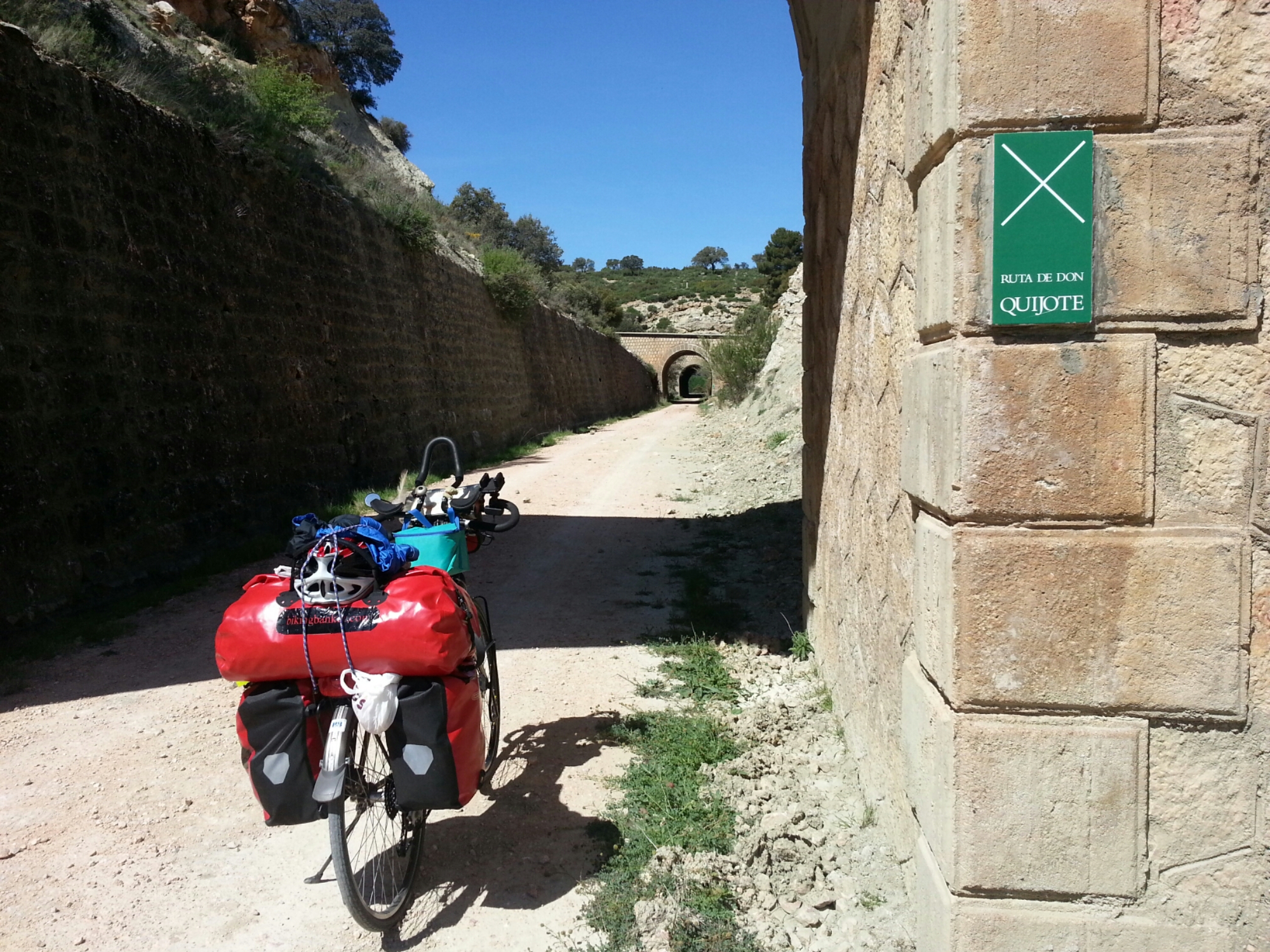 Die eerste 36km waren dus heerlijk rustig. Een dalende via verde en vrijwel geen ander verkeer. Een stuk of twintig tunnels waar het licht om de zoveel meter aanspringt als je je in de tunnel fietst. Voor de zekerheid draag ik een hoofdlamp, omdat de verlichting van de via verde bij Valencia nog wel eens was uitgevallen. Mijn fietsverlichting is niet heel fel namelijk. En iedere keer als ik in een tunnel fiets vliegen allerlei vogels de tunnel uit (nee, geen gieren.. 😉 ). De mussen en andere kleine soorten verblijven daar ongetwijfeld vanwege de koelte of soms voor het water dat op plekken naar beneden sijpelt. Af en toe spot ik een vleermuis.