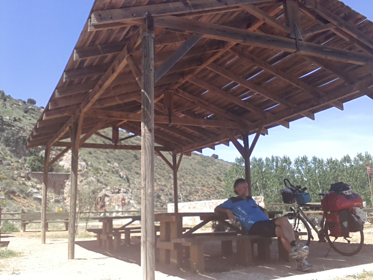 En zo geschiedde. Maar eerst moet ik vertellen van mijn eerste kampeerplan. Na de rustdag was ik van plan nu eindelijk eens een camping op te zoeken en het plaatsje waar ik wil eindigen, Siles, heeft er twee. Het is ca. drie uur in de middag als ik voorbij Siles bij een afslag kom, waar borden naar de twee campings verwijzen. Eén bord ziet er versleten en verweerd uit: dat is de camping die nog 1km te gaan is. Het andere bord is nieuw, groot en met een foto van een aantrekkelijk zwembad! Voor deze camping moet ik alleen nog 6km doorfietsen. O ja, en bij beide staat vermeld dat ze het hele jaar open zijn. Nou, ik kan dus kiezen.